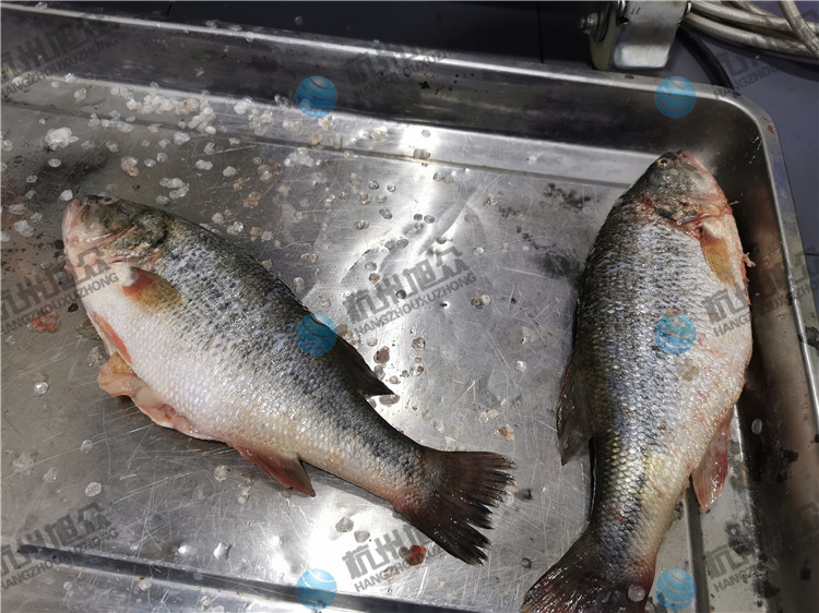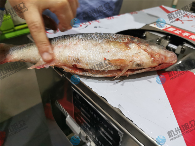 杭州客戶親自來廠試機,開肚去鱗殺魚機——1.2斤鱸魚開肚去鱗效果!